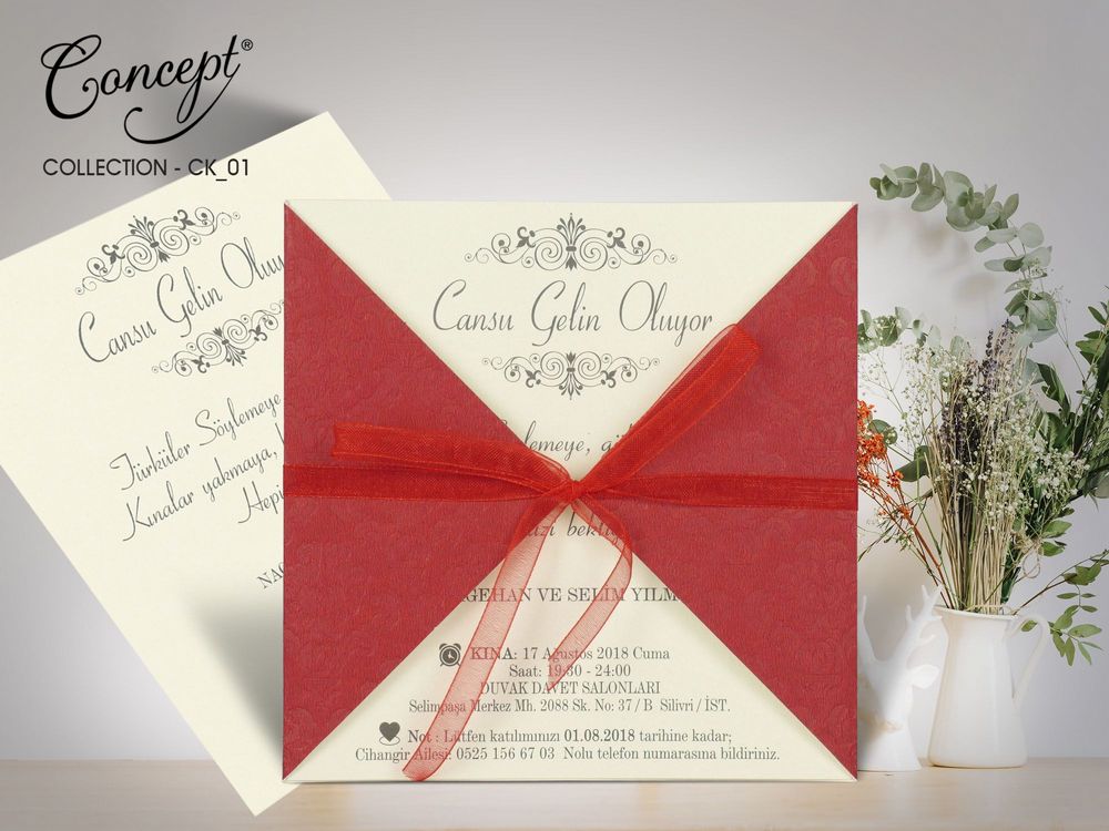 Kına kartı kına gecesi için gönderilen ve davetlilere gönderilen kart türüdür kına kartı düğün kartından önce bastırılan ve çok basılan kart türü olandır kına kartı